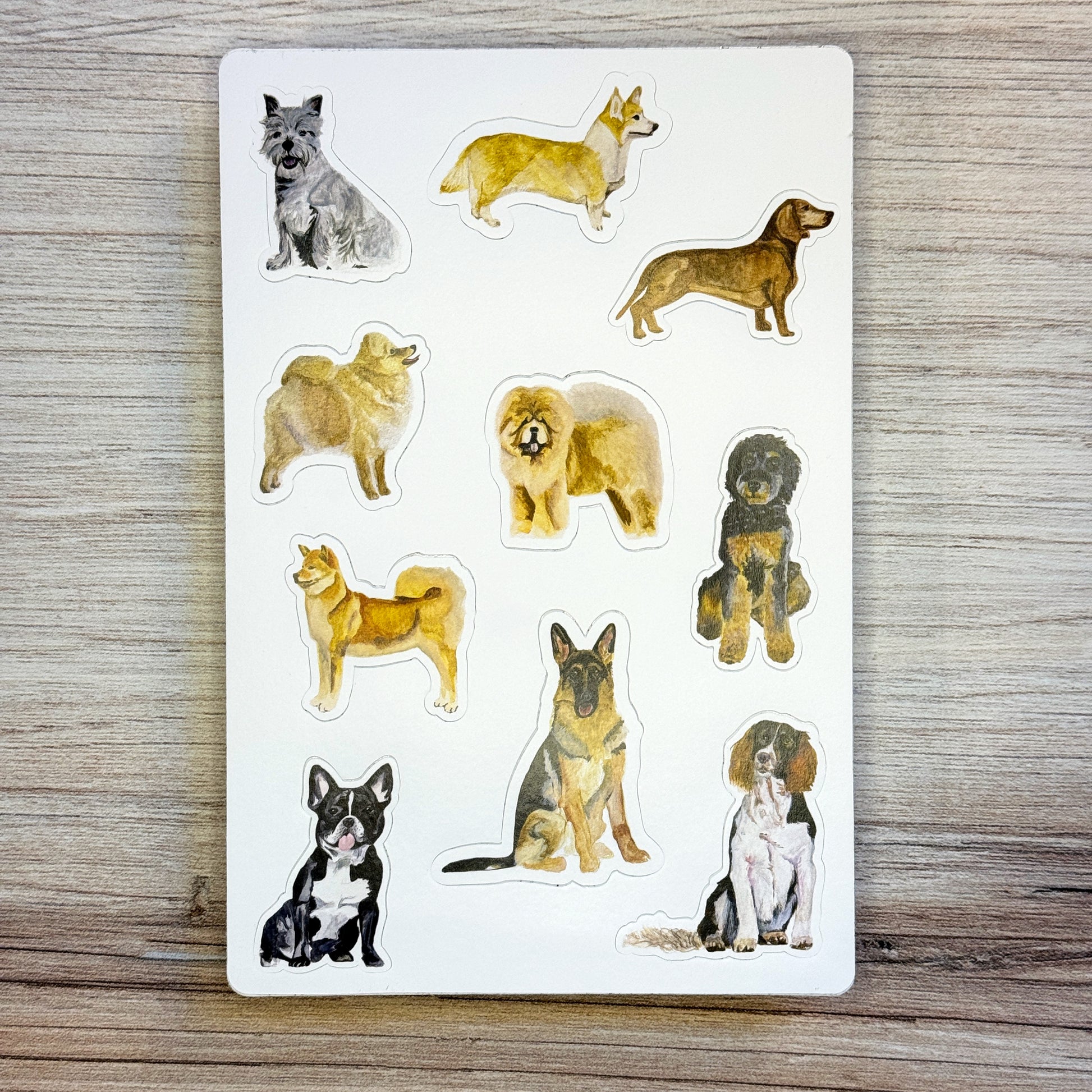 Doggone cute stickers. 10 stickers per 4" L × 6" W sheet printed in full color on durable white sticker paper. Featuring the Westie, Corgi, Dachshund, Pomeranian, Chow Chow, Golden Doodle, Shiba Inu, Frenchie, German Shepherd, and English Springer Spaniel.