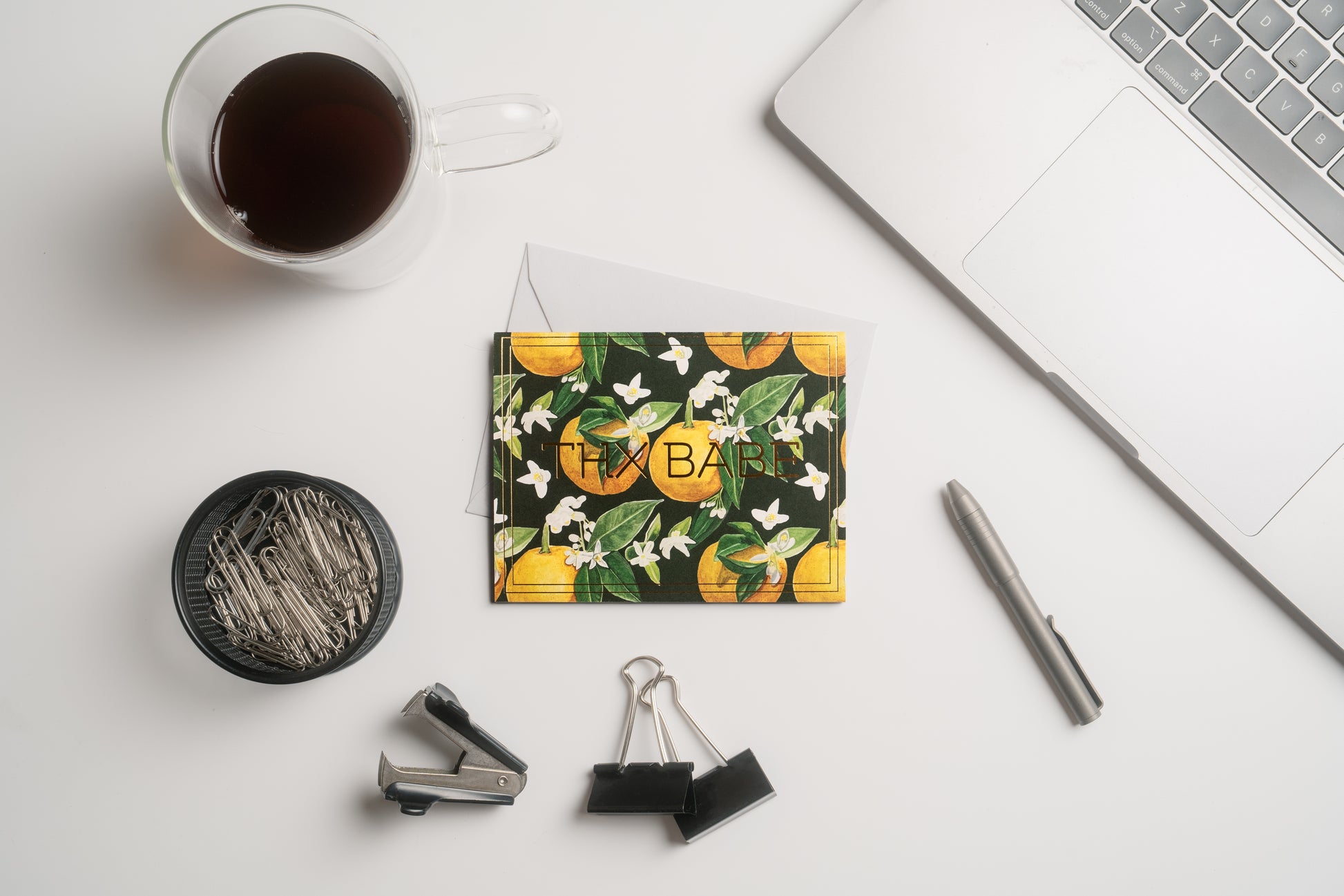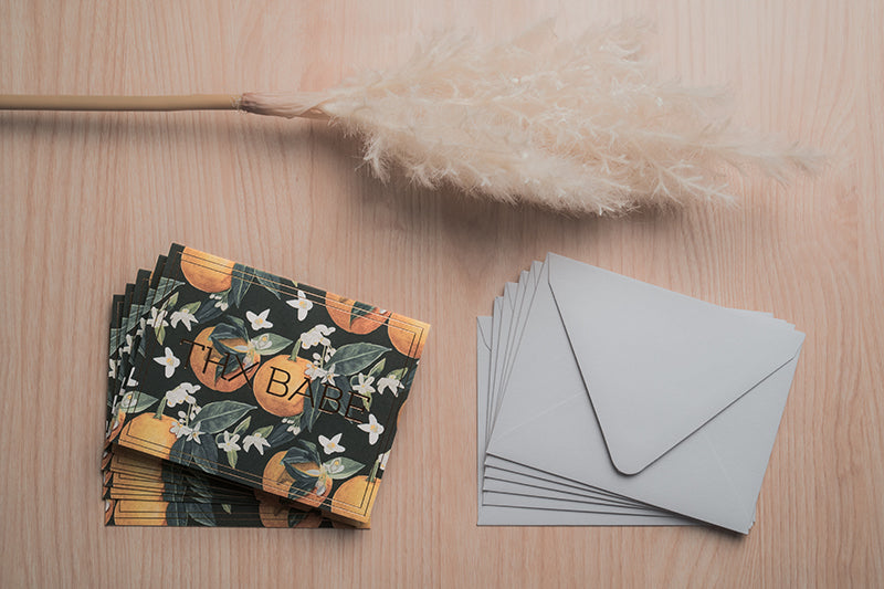 Show some appreciation to your babes with this set of 6 folded cards, each measuring 4 1/4" x 5 1/2" and paired with a Luxe Gray A2 envelope. The white cover paper is adorned with full color prints and metallic gold foil stamping. Blank inside so you can keep your messages personal. Gratefully made in the USA!