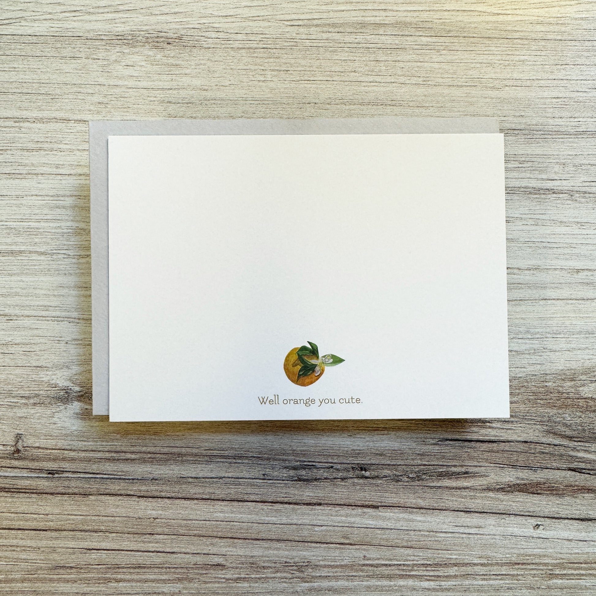 The adorably punny Orange Blossom "Well Orange You Cute" Card measures 3 1/2 x 4 7/8" and features a vibrant design. It also includes a 4Bar-sized Luxe Gray envelope for added charm.