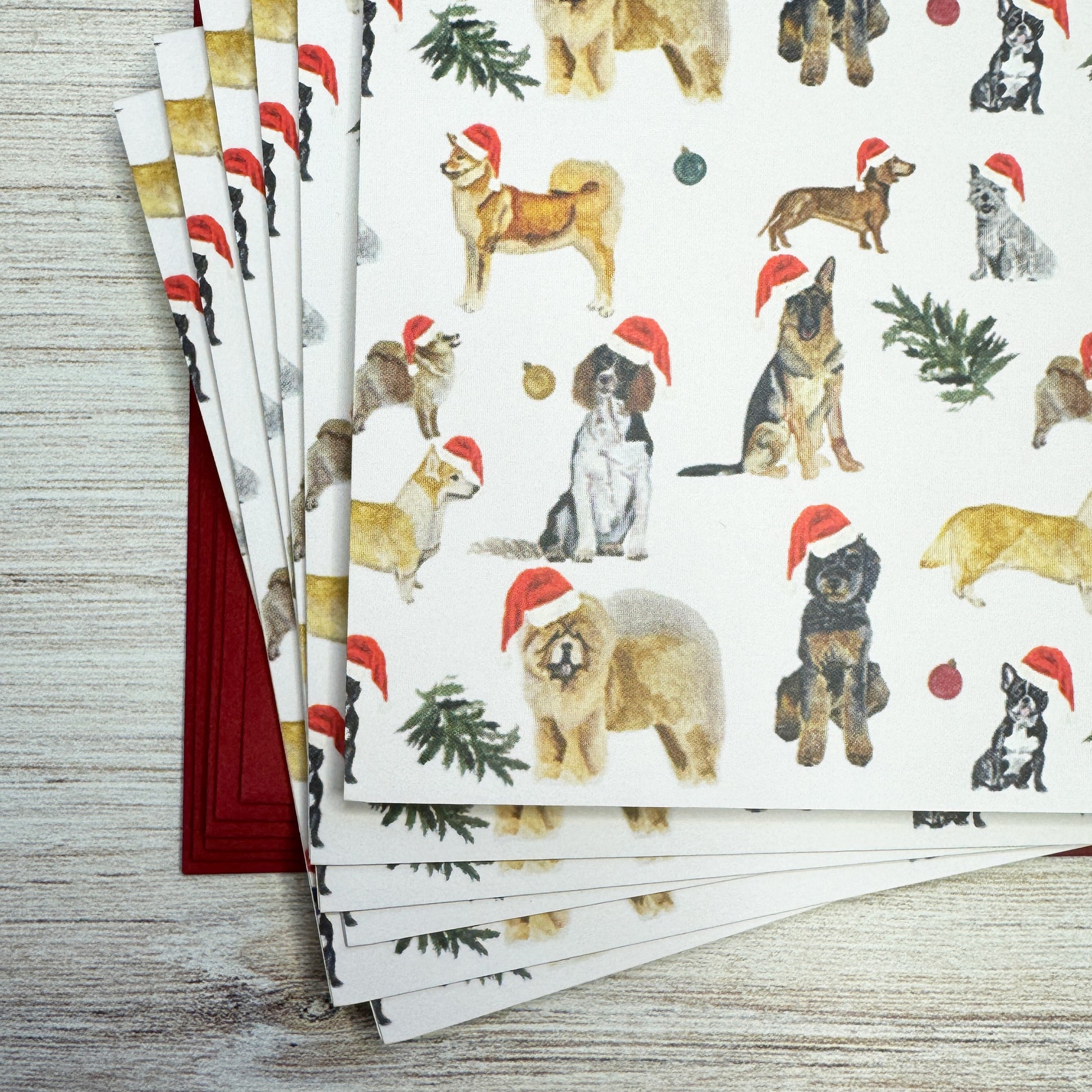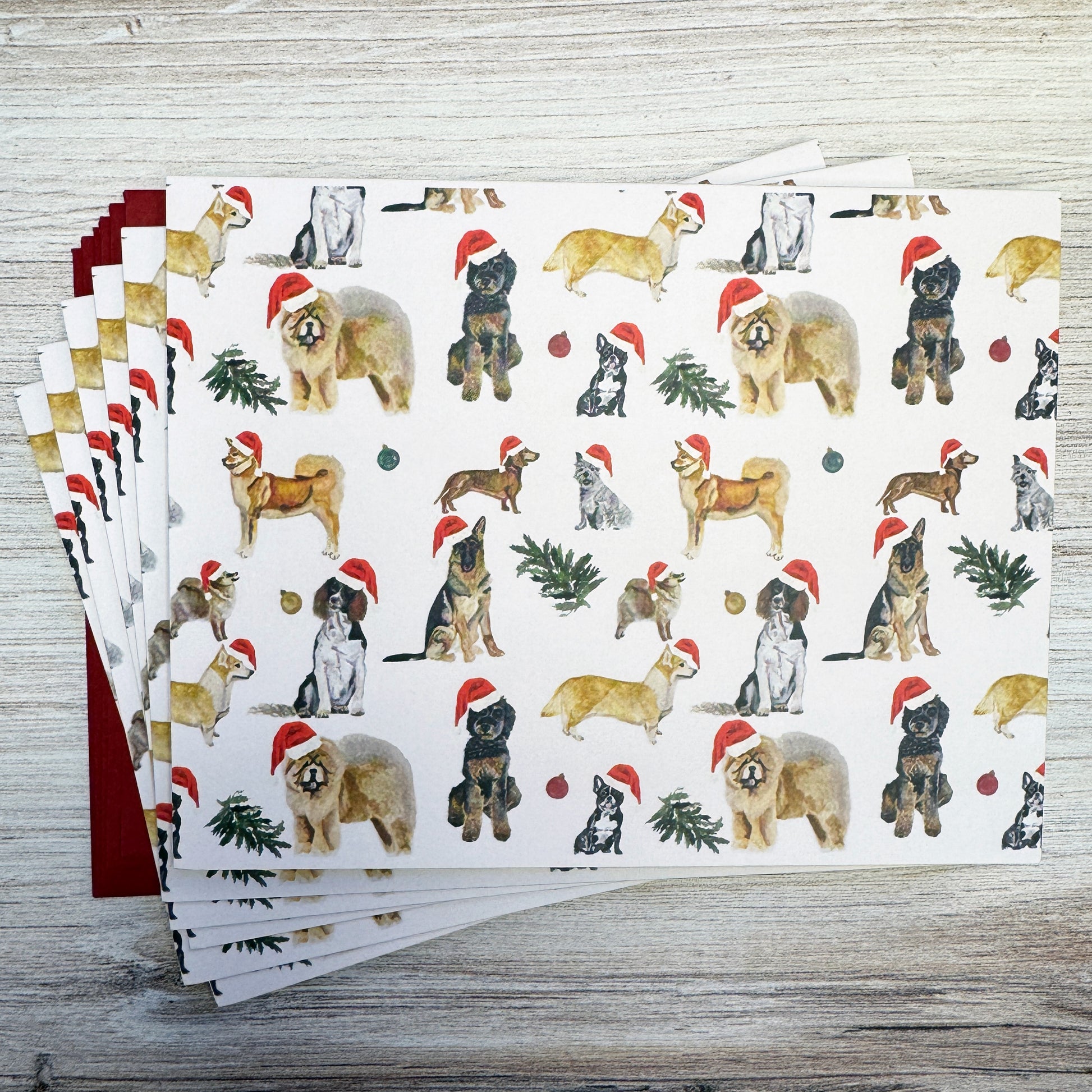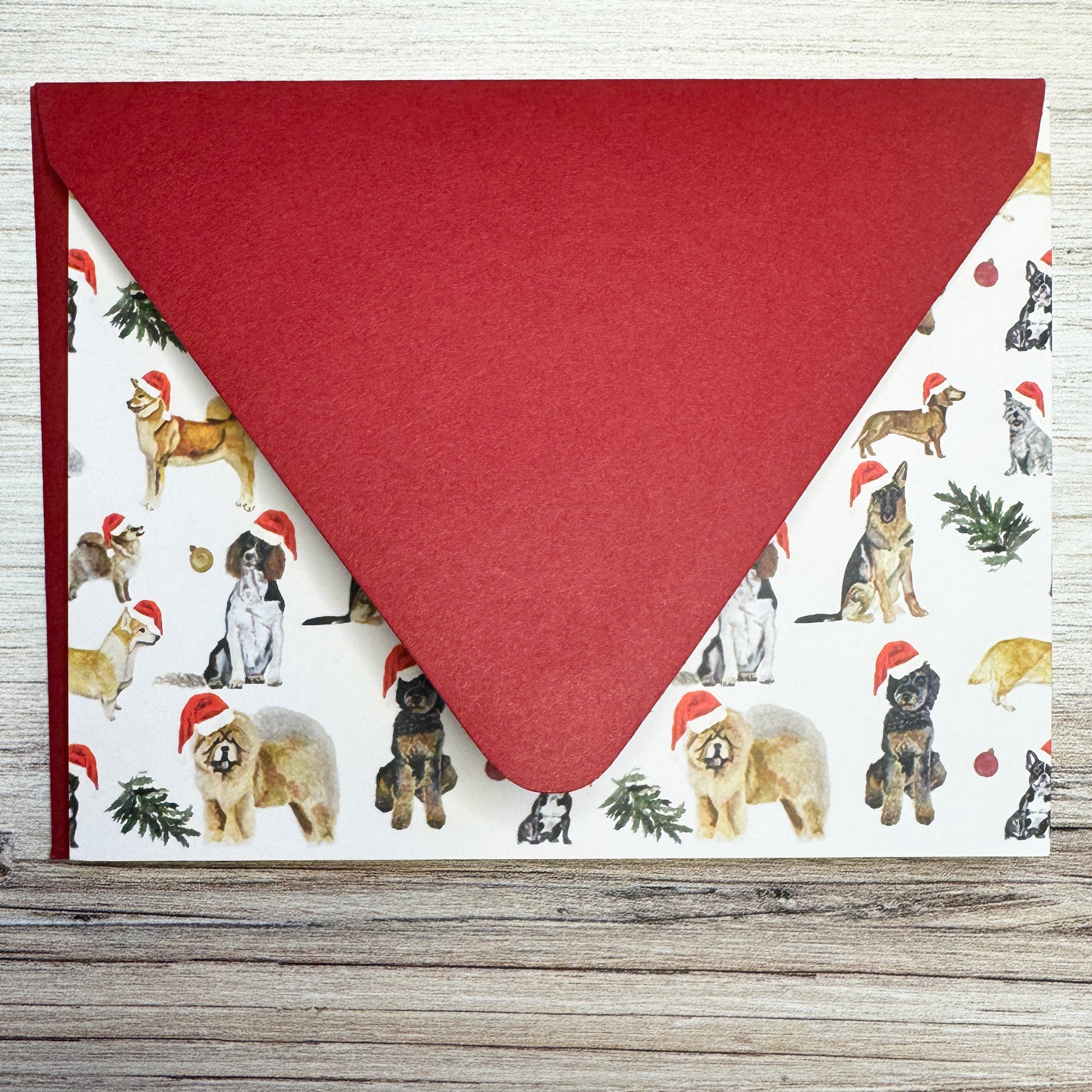 Spread joy to loved ones with these holly jolly doggos. Enjoy six vibrant printed cards on high-quality paper, paired with six red A2 envelopes. Proudly made in the USA!